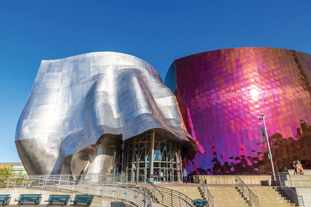 Celebrated architect Frank Gehry designed this fanciful building in the heart of Seattle Center’s cultural campus in 2000. The exterior is clad in undulating sheets of steel and aluminum in a kaleidoscope of bold colors, including “purple haze,” a tribute to Seattle-born rocker Jimi Hendrix and the city’s deep rock and roll roots.