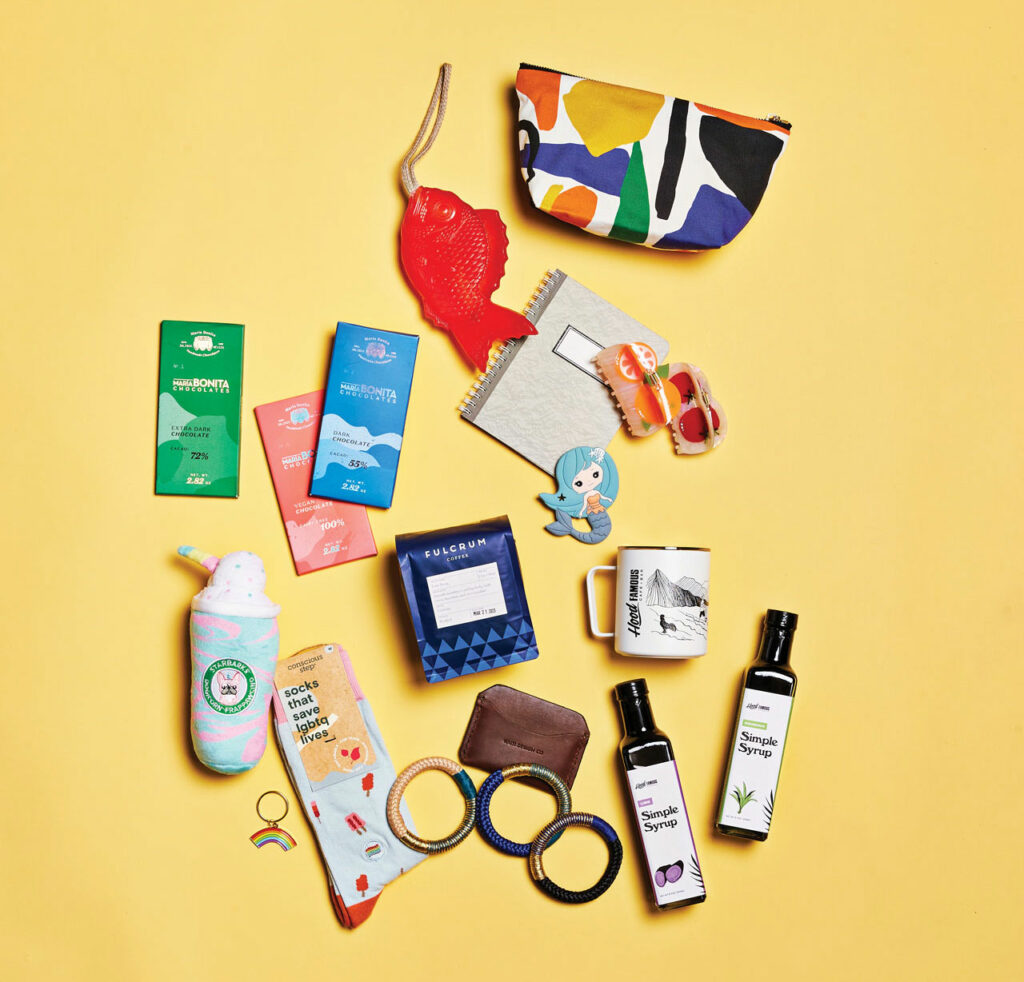 Pick up these playfully designed popsicle socks, a rainbow keychain, or a Starbarks Dogicorn Frappawcino dog toy at the festive Capitol Thrill (1205 E Pike St), which sells accessories, books, pins, games, and pet goods from queer and BIPOC artists.